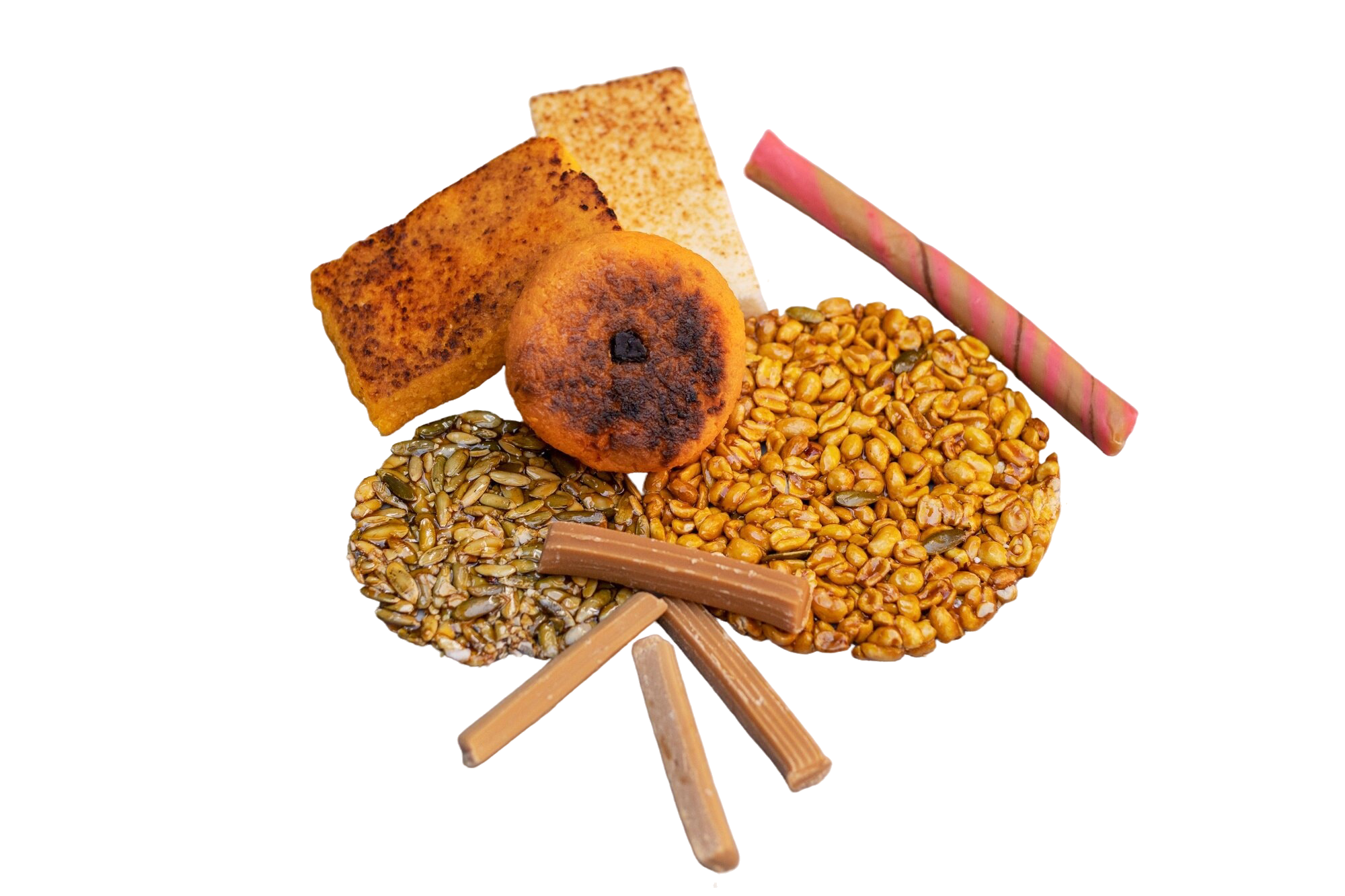 Khari, nankhatai, rusk, khakhra, fryums, ready-to-eat foods, ready-to-cook mixes, spice blends, and FMCG packs.